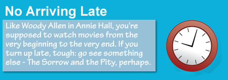 I have been guilty of being late once or twice for a movie, but I paid for it by sitting right at the front and suffering neck ache later. Years ago I remember watching one of the LOTR movies and a woman came in late. She dragged 2 kids behind her, all the way along the row past me. Lots of fidgeting, removing of jackets, popcorn being handed around, arguments over drinks, screw Gandalf and his epic speeches because someone didn’t get their ice-cream. Back out she went. Ice cream in hand she came back. About 30 mins later she took one of her sons out because he needed to go pee-pee. Before the movie was over both sons had been to the toilet and probably missed at least 40 mins of the movie.