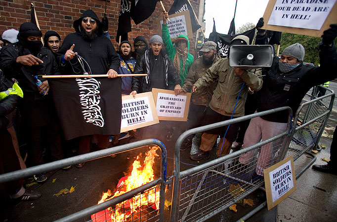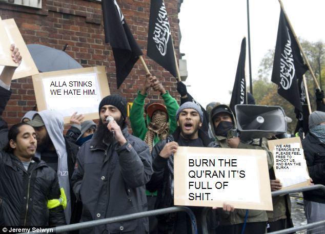 I know the picture to the left has been Photoshopped but consider the reaction should the placards actually show those words. Think what would happen if anyone stood in a crowded street with a banner that said something like “Poppy Burning Muslim Extremists Must Die!” Or even: “Burn the Qur’an – It’s full of shit.” Would that be acceptable? I don’t think so. Why has this country allowed these kinds of people to live here, possibly not paying taxes, living off benefits and not contributing anything to society, to make this kind of statement without very severe repercussions? Why is our country so incredibly weak to the point of being frightened to create waves with more strict policies that govern this sort of thing?