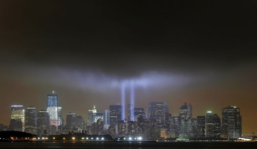 Two lights from the former site of the World Trade Centers shine for the 10th anniversary of 9/11.