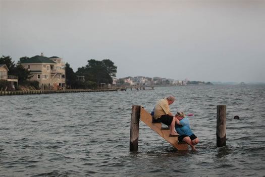 August 28, 2011. Billy Stinson comforts his daughter Erin Stinson as they sit on the steps where their cottage once stood on  in Nags Head, N.C. The cottage, built in 1903 and destroyed by Hurricane Irene, was one of the first vacation cottages built on Albemarle Sound in Nags Head.