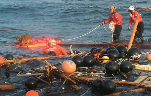 April 1, 2011. Members of the Japan Coast Guard rescue a dog after it was found drifting on the roof of a tsunami-wrecked house floating off Kesennuma, northeastern Japan. The dog wore a collar, but there was no address on it.