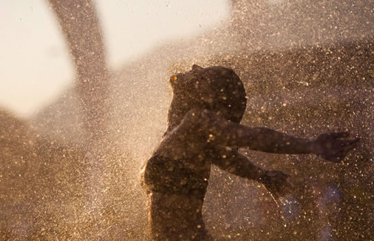 October 1, 2011. A woman walks into a spray of water to escape the heat during the Rock in Rio music festival in Rio de Janeiro, Brazil.