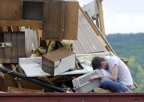 April 28, 2011. Andy Page cries as he sits with his cat, Ellie, placed in a pet carrier, in his demolished apartment in Trenton, Georgia, after overnight storms hit the North Georgia and Chattanooga, Tennessee, area. Page has several cats and Ellie was the last one he was looking for.