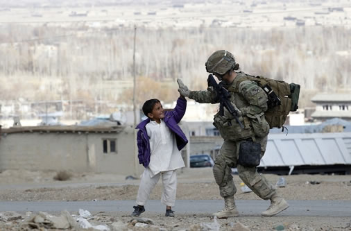 A U.S. Army soldier takes five with an Afghan boy during a patrol in Pul-e Alam, a town in Logar province, eastern Afghanistan.