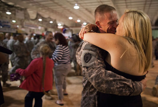 December 6, 2011. A couple embraces as soldiers of the 25th Infantry Division are greeted by family, friends and loved ones at their redeployment ceremony at Wheeler Gulch, Wheeler Army Airfield in Wahiawa, Hawaii.  U.S. forces are withdrawing from Iraq after an eight year presence in the country and communities in Hawaii are welcoming soldiers home.