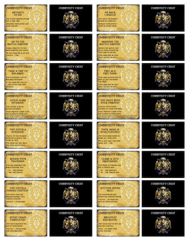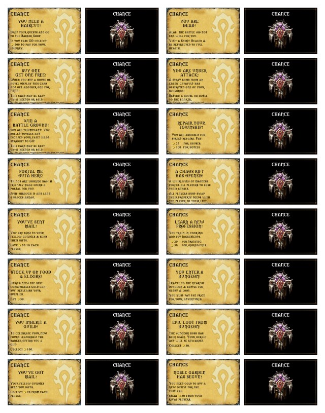 Now I’ve updated my World of Warcraft Monopoly board, click this thing to see it, I thought it best to give the Title Deeds, Chance and Community Chest sets a face lift. I haven’t changed a lot as they looked kind of okay. Sharpened the graphics up and adjusted a few bits and pieces to match the new board. I figure someone somewhere might want to download the new sets.