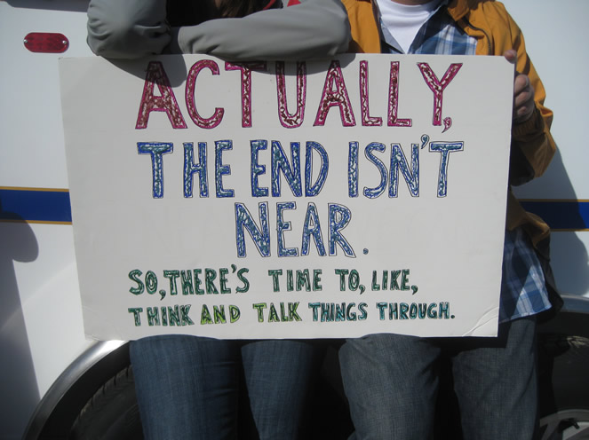 The best you can hope for is a spot on an airship. Not a plane. Plane’s run out of fuel too fast. In an airship you can cruise above the apocalypse, take photos, and allow yourself a moment of smugness. Not because you were clever enough to avoid the crunchy wet mess on the planet below, no, that would be cruel. Your smug smile will come from knowing those crazy sign waving doomsday idiots were so wrapped up in their own smug “I told you so” bullshit they never thought to procure a seat next to you on the air ship.