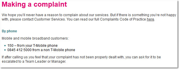 If you wish to complain to T-Mobile don’t bother calling the number on their website. It may appear as if it’s there for you to make a complaint but it links to their normal customer services number.