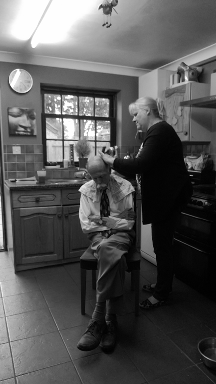 There was no need to visit a barber when his daughter, Sarah, did such a fine job every time. I have a variety of photos of Roy seated in our kitchen with Sarah snipping away.
