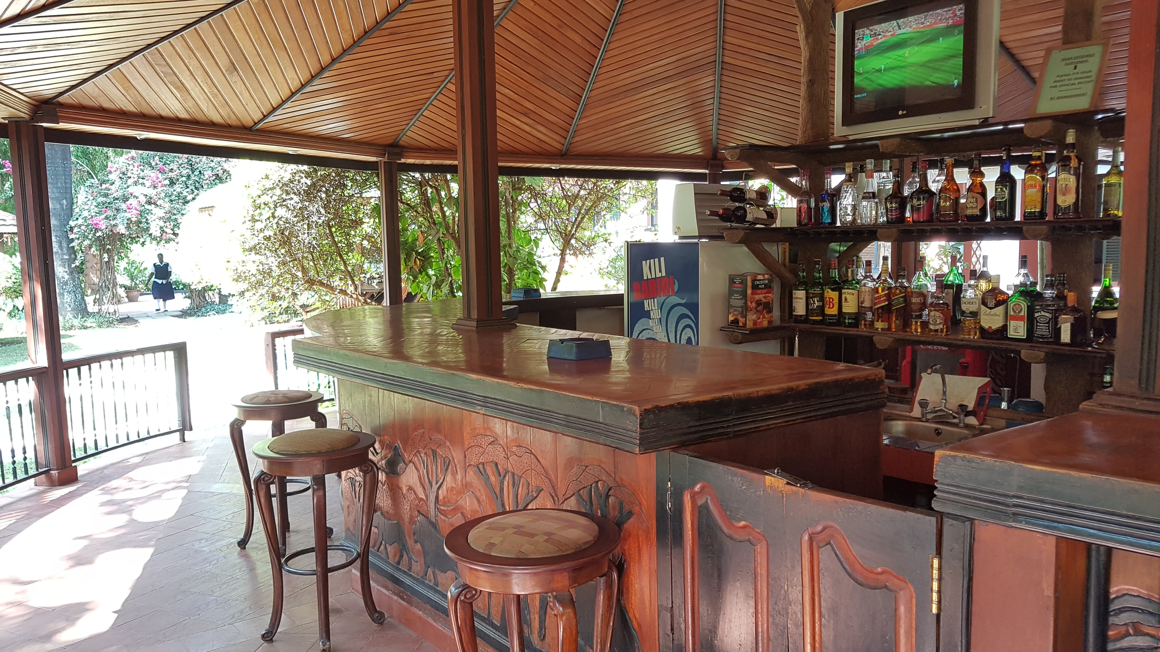 Only when stood on the path, lost in thought, did I notice how the bar was carved with an African theme.