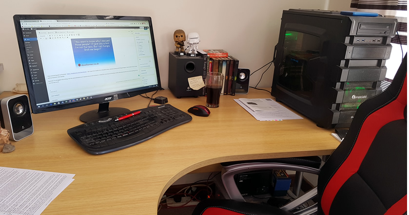 I have a nice desk set up – neat and tidy and a chair that’s easy on the back and the butt.