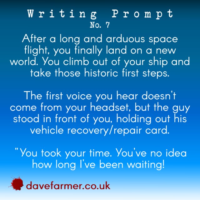 Writing Prompt Wednesday #7 On June 14, 2017June 8, 2017 By Dave FarmerIn writing prompt Think fast, dear blog reader, this dude needs his car reparing. He’s been waiting long enough so get fixing! You can explore later. Customer service is important. Rate this:Share this: Click to share on X (Opens in new window) X Click to share on Facebook (Opens in new window) Facebook Click to share on Reddit (Opens in new window) Reddit Click to share on Pinterest (Opens in new window) Pinterest Click to share on LinkedIn (Opens in new window) LinkedIn Click to share on Tumblr (Opens in new window) Tumblr Click to share on WhatsApp (Opens in new window) WhatsApp Click to share on Pocket (Opens in new window) Pocket Click to email a link to a friend (Opens in new window) Email Click to print (Opens in new window) Print Click to share on Telegram (Opens in new window) Telegram Like Loading... Related
